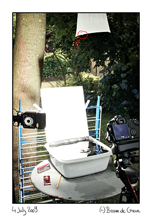 July 31st, 2009Earlier this month, on a warm lazy Saturday, I was sitting idle in the flowery garden. Tired of reading books, I decided to setup a little studio under the walnut tree and shoot some water drops. The idea is very simple: hang a bag of water above a filled basin, and make a tiny hole so you get a slow but steady flow of drops splashing on the water surface below. Aim a speedlite at a white background, and shoot away!